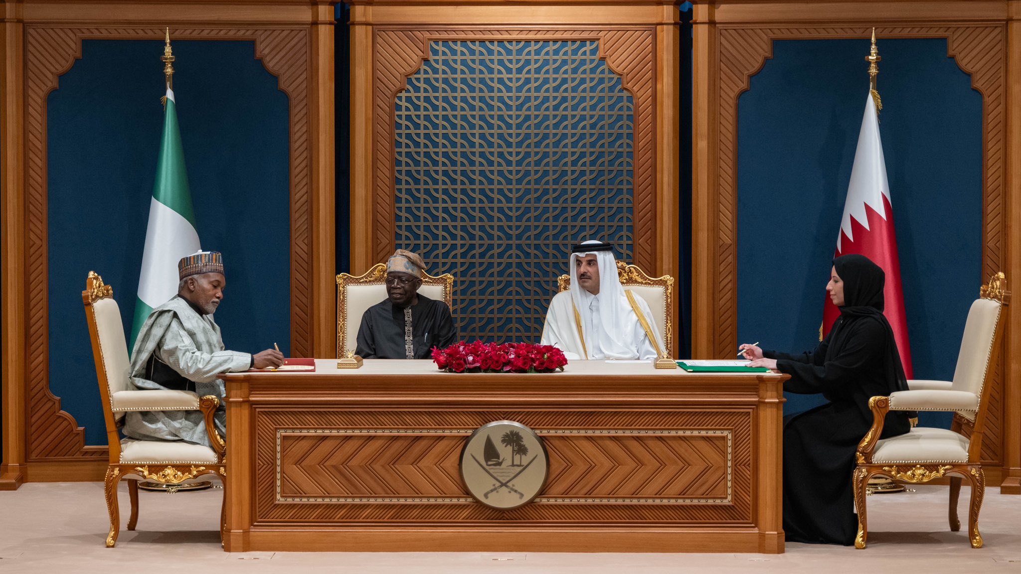 شهد حضرة صاحب السمو الشيخ تميم بن حمد آل ثاني أمير البلاد المفدى، وفخامة الرئيس بولا أحمد تينوبو رئيس جمهورية نيجيريا الاتحادية، اليوم في الديوان الأميري التوقيع على عدد من الاتفاقيات ومذكرات التفاهم بين حكومتي البلدين.